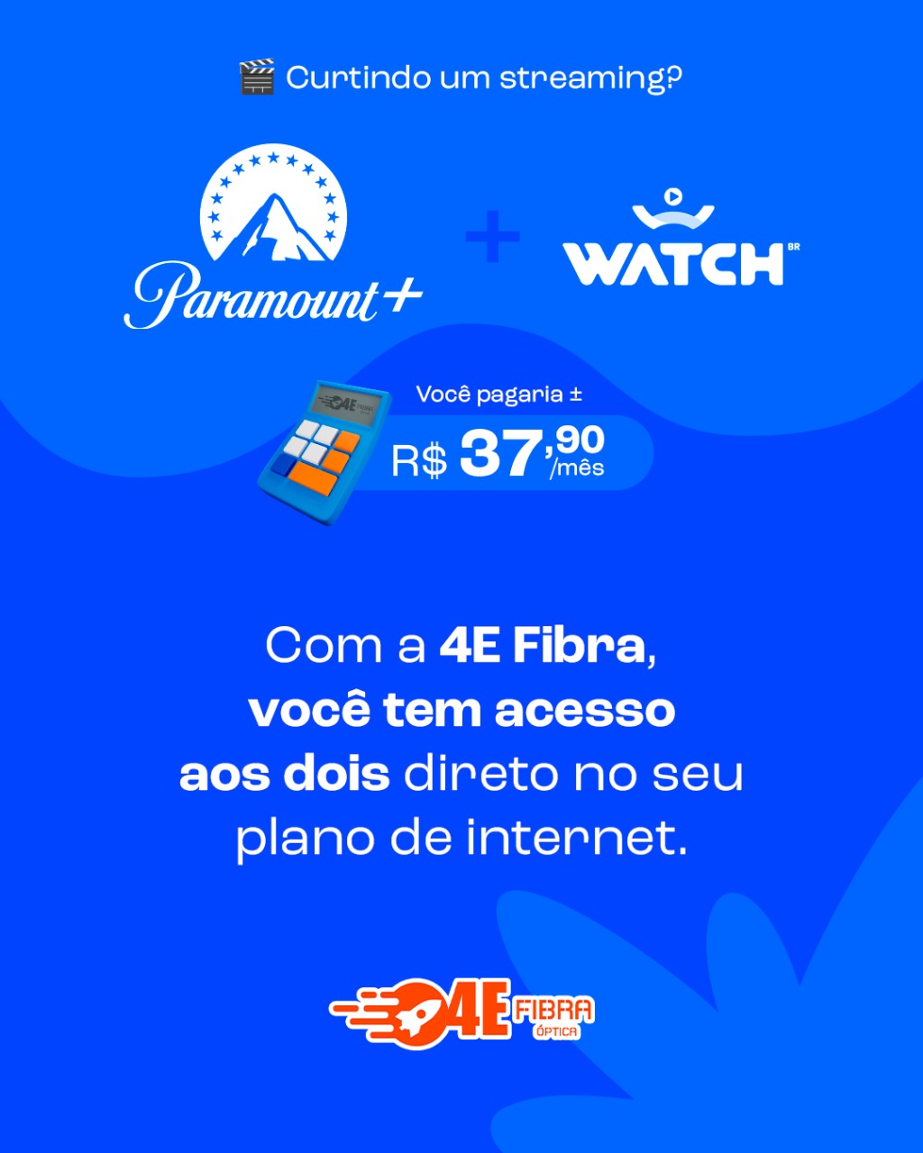 COM A 4E FIBRA, VOCÊ TEM ACESSO À PARAMOUNT PLUS E WATCH BRASIL, DIRETAMENTE NO SEU PLANO DE INTERNET.