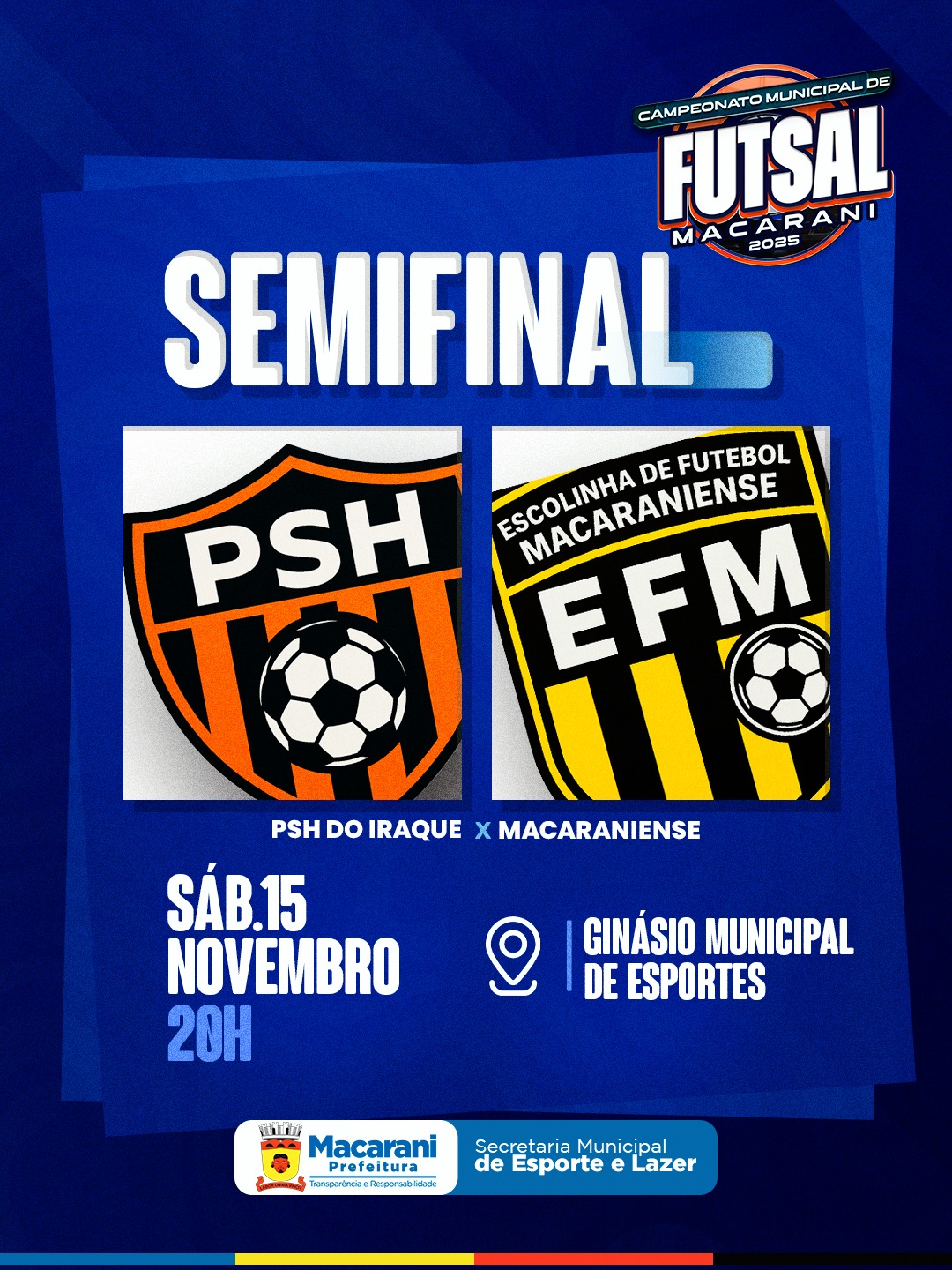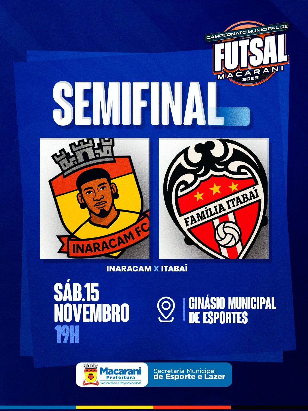 AS SEMIFINAIS DO CAMPEONATO MUNICIPAL DE FUTSAL ACONTECEM NESTE SÁBADO 15 DE NOVEMBRO, NO GINÁSIO DE ESPORTES DE MACARANI.